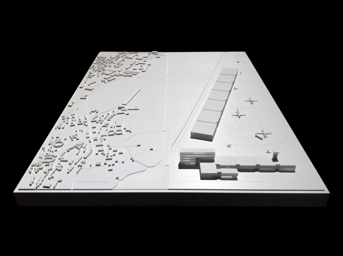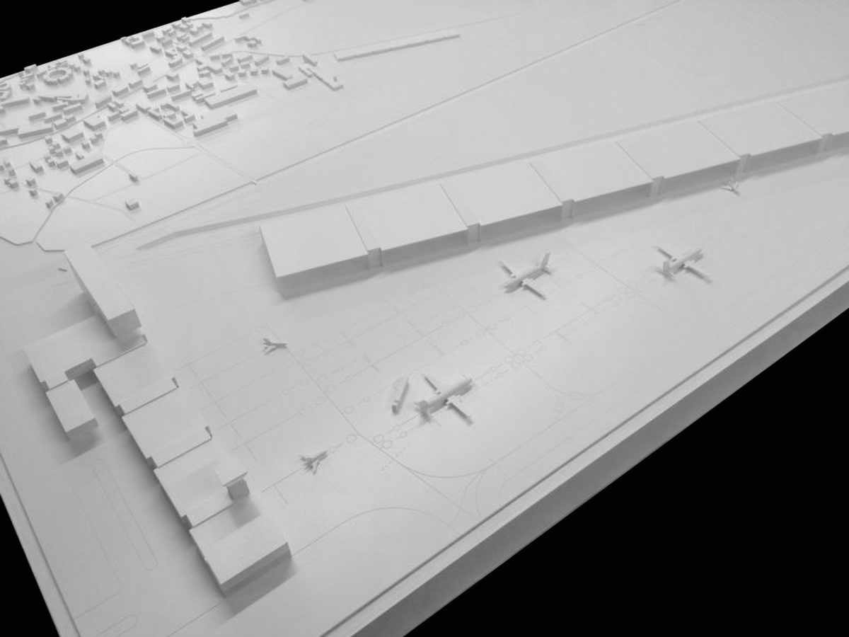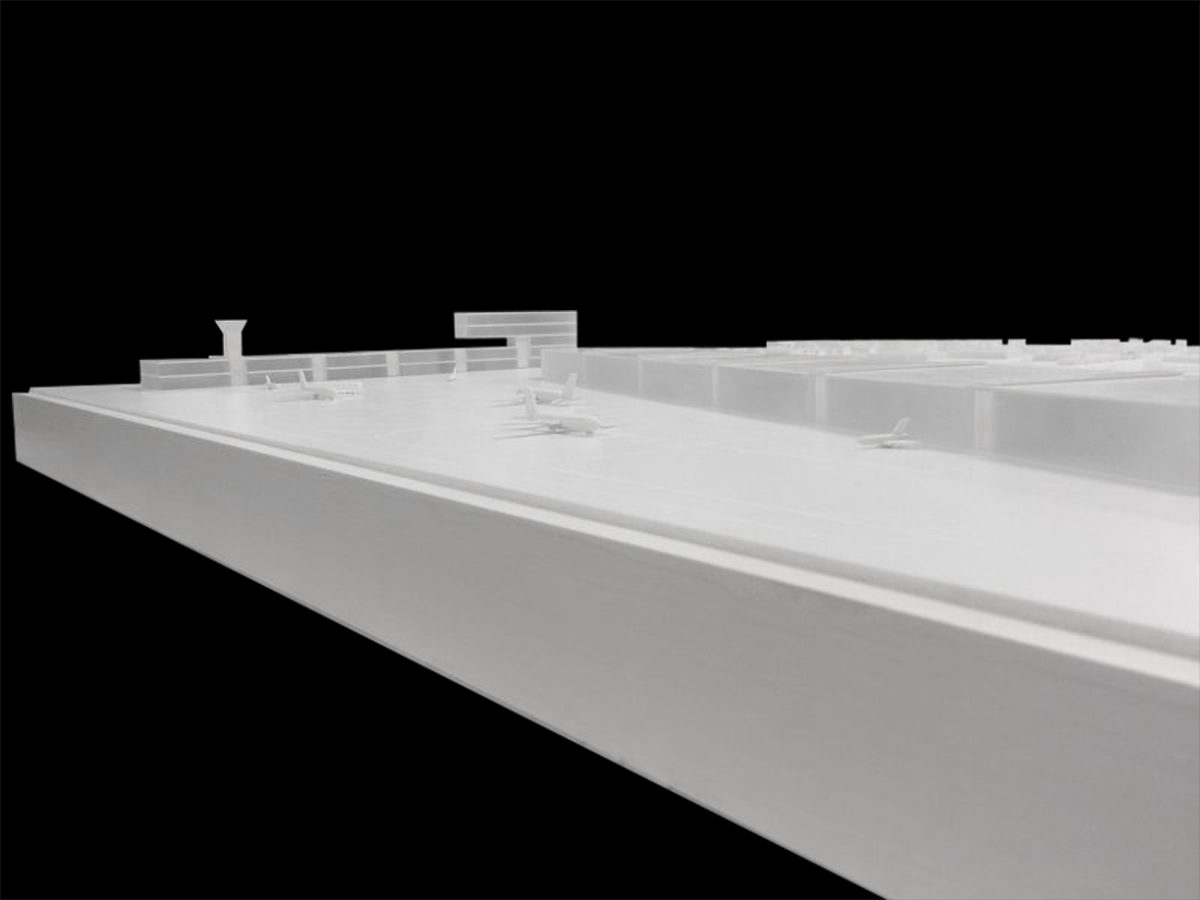 Modello architettura in scala 1:2000 e 1:500 dello studio di ampliamento dell’aeroporto Agno di Lugano, Ticino. Il materiale utilizzato per i modelli è pvc espanso bianco.