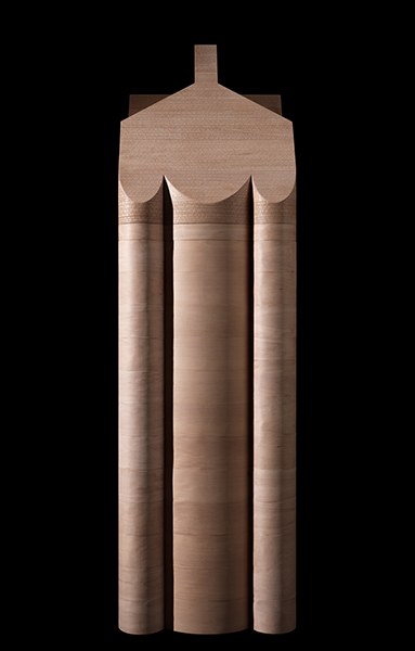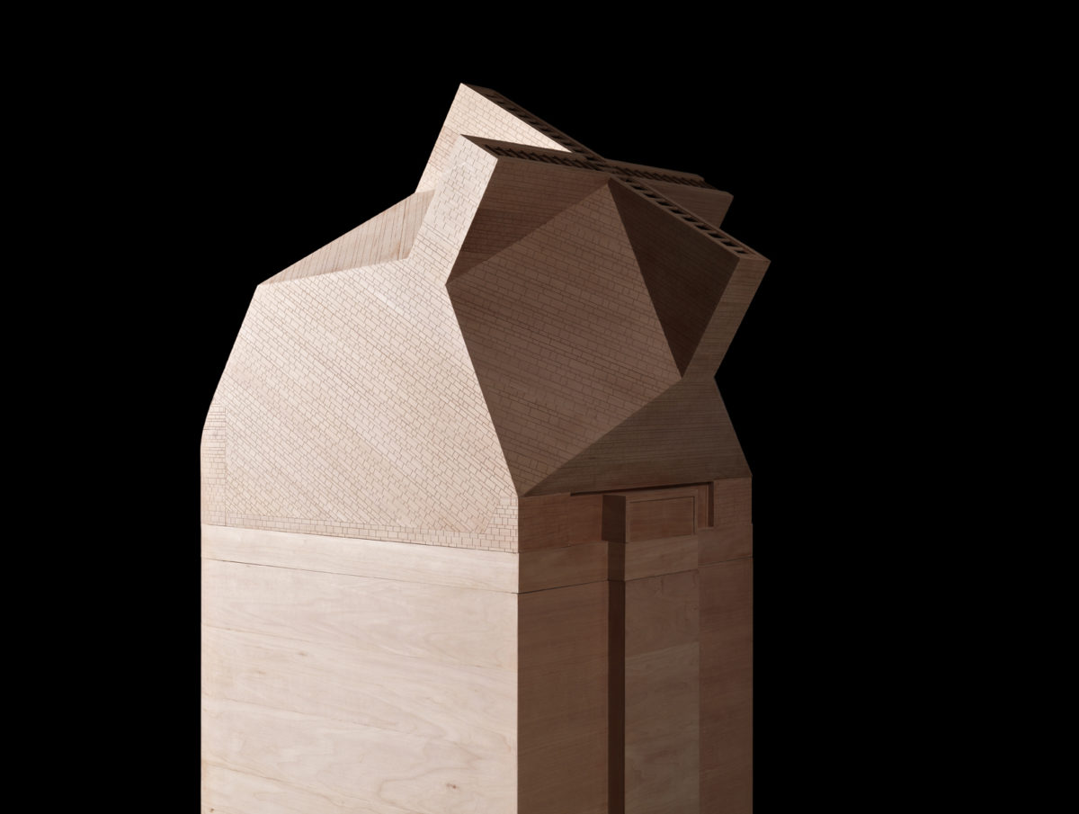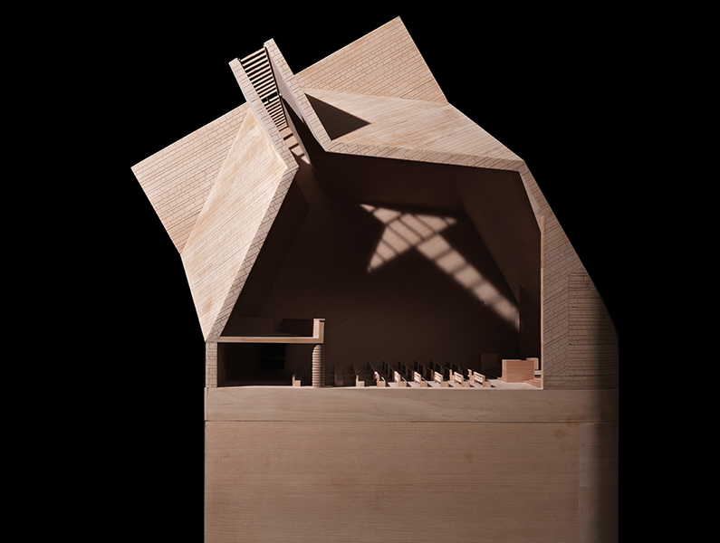 Modello architettura in scala 1:50 su sezione di una parete laterale, della chiesa di San Rocco a Sambuceto progettata dall’architetto Mario Botta. Realizzata in legno di pero con dettagli estremamenti accurati. Committente, Studio Arch. Mario Botta