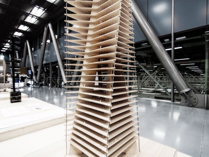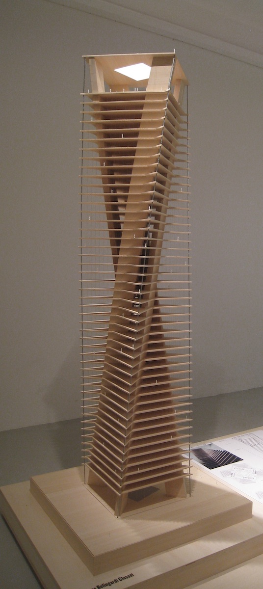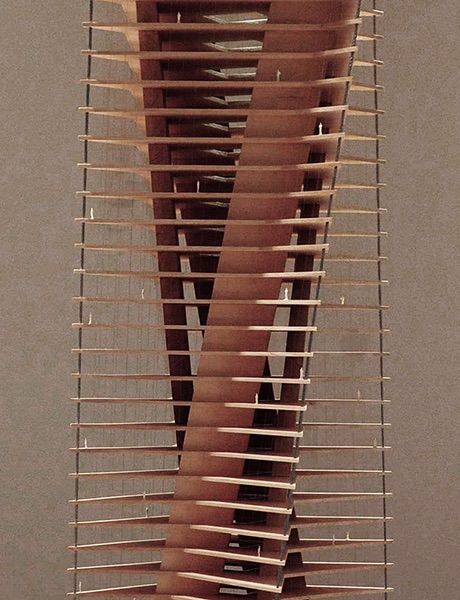 Modello architettura in scala 1:100 di edificio a torre per concorso CASABELLA Laboratorio.Realizzato in legno massello. Committente studio BE.ST